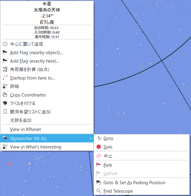 KStars で、その目標の天体の上で右クリックして [Mount名]→[Sync]をクリックすると sync point が作られて望遠鏡架台と INDIサーバーのマウントドライバの座標の同期が行われる(one star alignment)。