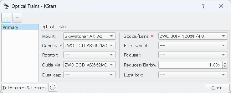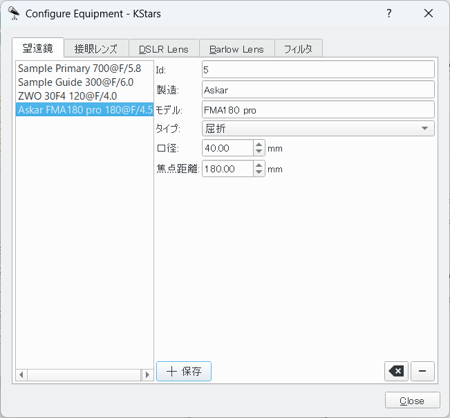 Scope/Lens については以下の手順で使用する鏡筒などの情報をリストに追加しておく必要がある。