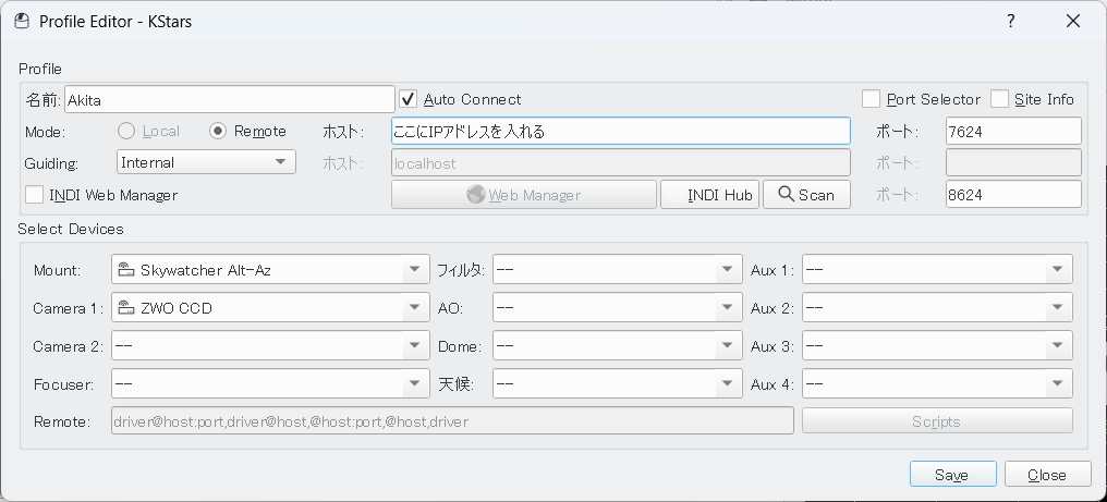 Mode は [Remote] を選択してホストには INDIサーバーの IP Address を入力する。